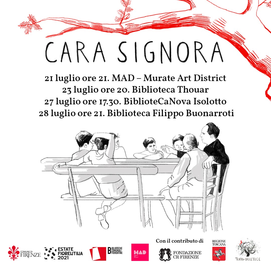 Evento realizzato dal Teatro dell'Elce con il contributo del Comune di Firenze – Estate Fiorentina 2021 e con la collaborazione delle Biblioteche Comunali Fiorentine e del MAD – Murate Art District. L’evento è parte del progetto “Teatro nelle città” realizzato con il contributo di Fondazione CR Firenze. Con il sostegno di Regione Toscana.