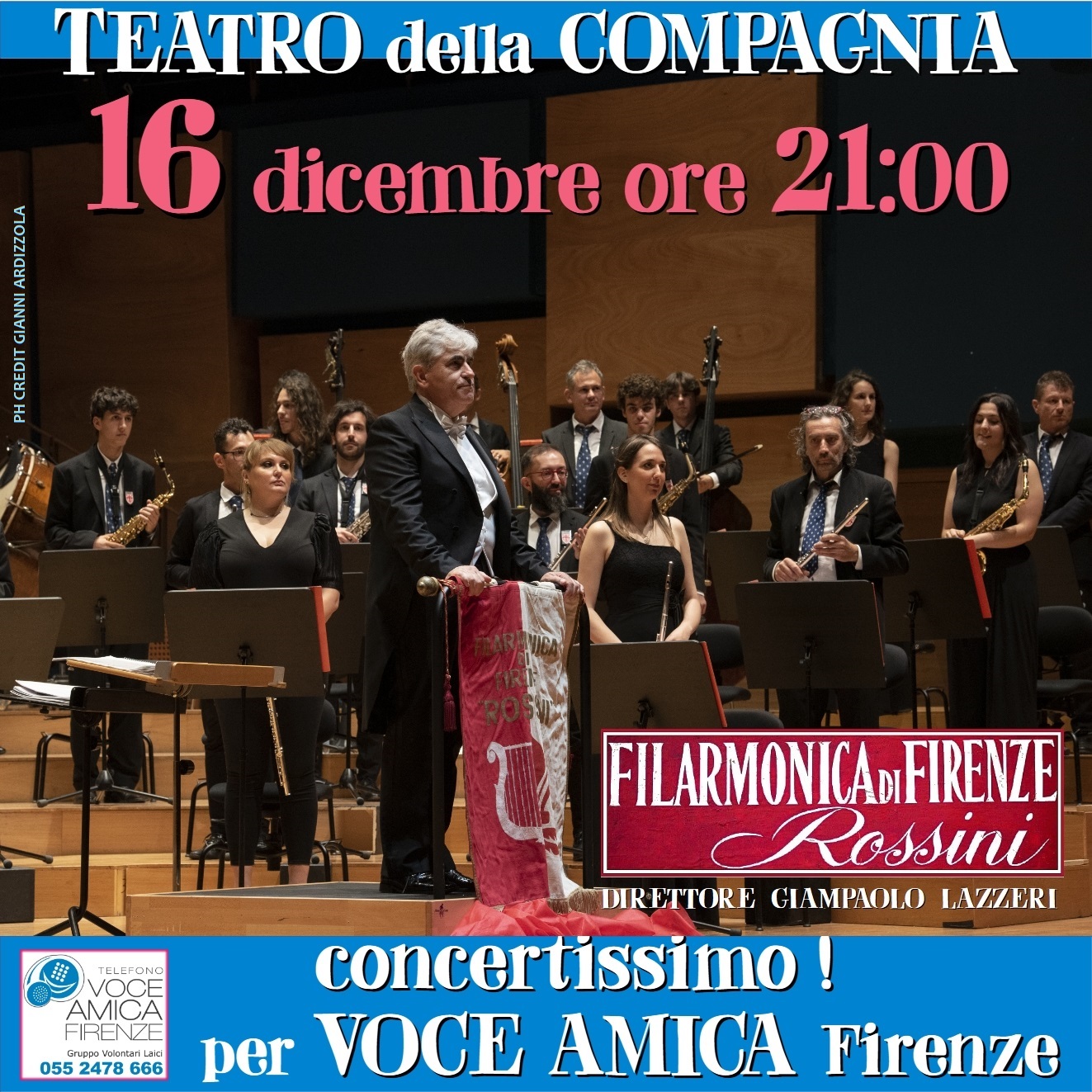 Martedì 16 dicembre ore 21.00, al Teatro della Compagnia, la Filarmonica Gioacchino Rossini offre la sua musica per Voce Amica Firenze