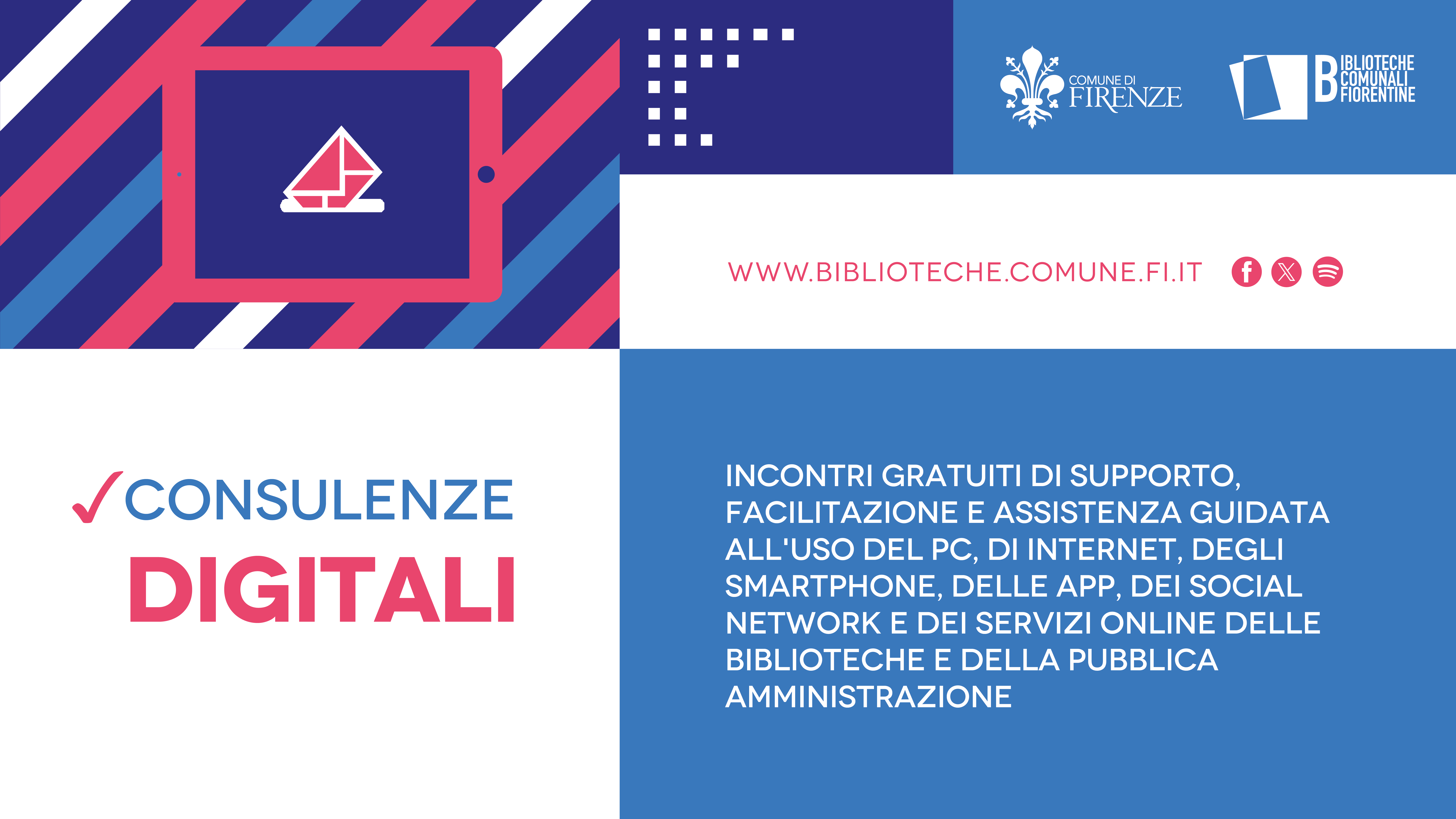 Le Biblioteche comunali fiorentine offrono un servizio gratuito di consulenza digitale, con incontri di supporto, facilitazione e assistenza guidata all’uso del PC, di Internet, degli smartphone, delle APP, dei social network e dei servizi online delle biblioteche e della Pubblica Amministrazione.