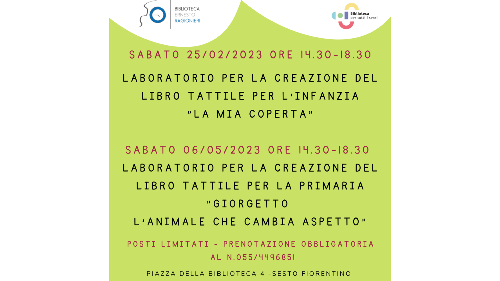 Grazie al progetto Biblioteca per tutti i sensi, finanziato dal Centro per il libro e la lettura e promosso da SDIAF (Sistema Documentario Integrato dell'Area Fiorentina), la Biblioteca Ernesto Ragionieri organizza due incontri per la costruzione di libri tattili. I laboratori, tenuti dalla Cooperativa Elfo, sono destinati a bibliotecari, educatori, insegnanti e genitori.