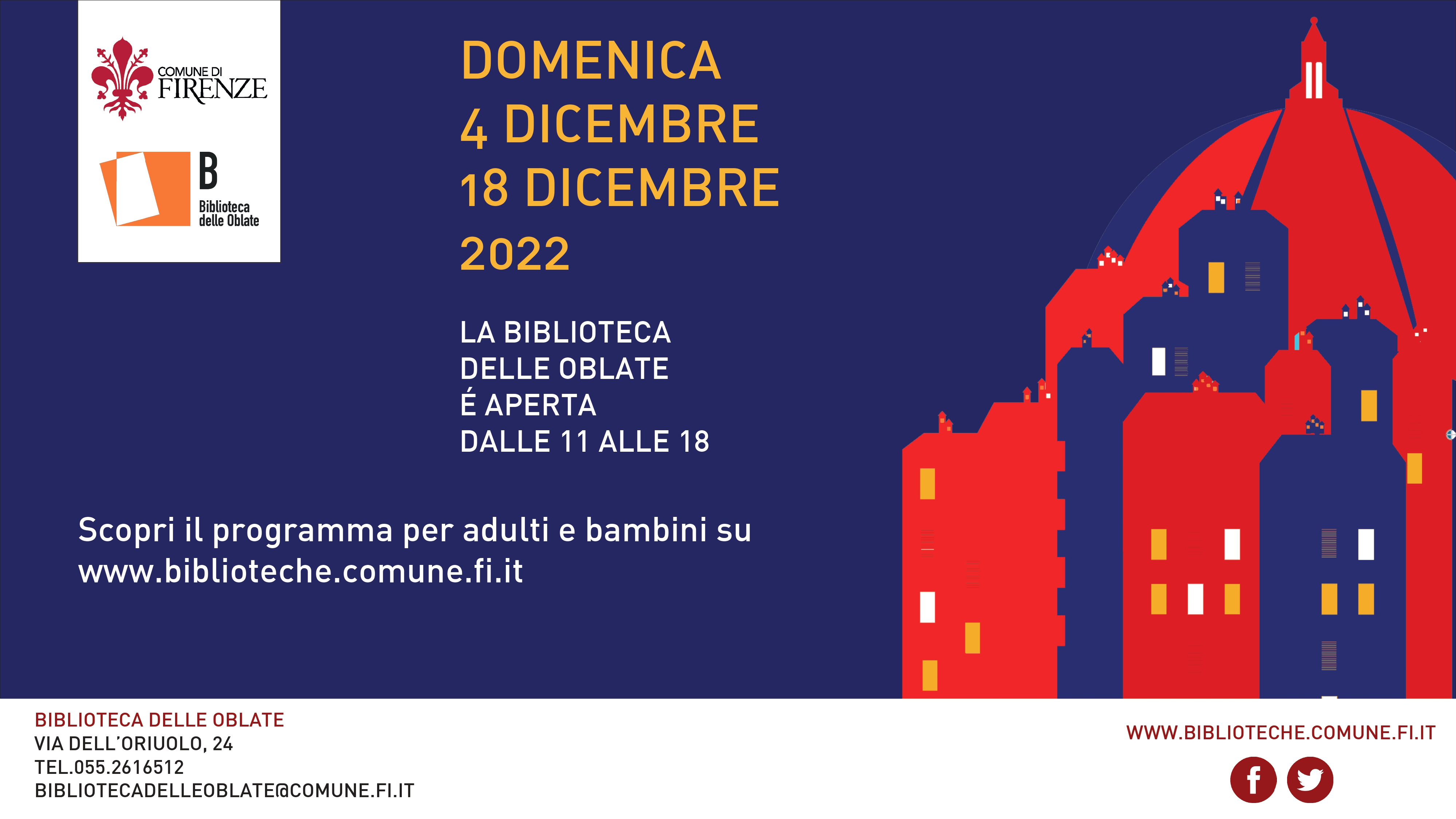 Tornano le aperture domenicali della Biblioteca delle Oblate. Domenica 4 e 18 dicembre la biblioteca è aperta sia per prendere in prestito libri che per studiare e partecipare alle letture e laboratori per bambini e alle attività culturali organizzate per gli adulti.