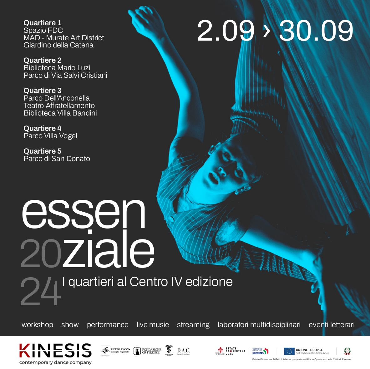 “ESSENZIALE” è una rassegna multidisciplinare, che si occupa di dare il proprio contributo nella sensibilizzazione dell’arte nella comunità. Un calendario di eventi diversi da loro per divulgare l’arte in tutto il suo splendore, valorizzando e facendo conoscere, a livello nazionale e internazionale, teatri, spazi urbani e spazi comunali della città di Firenze diversi da quelli più popolari.