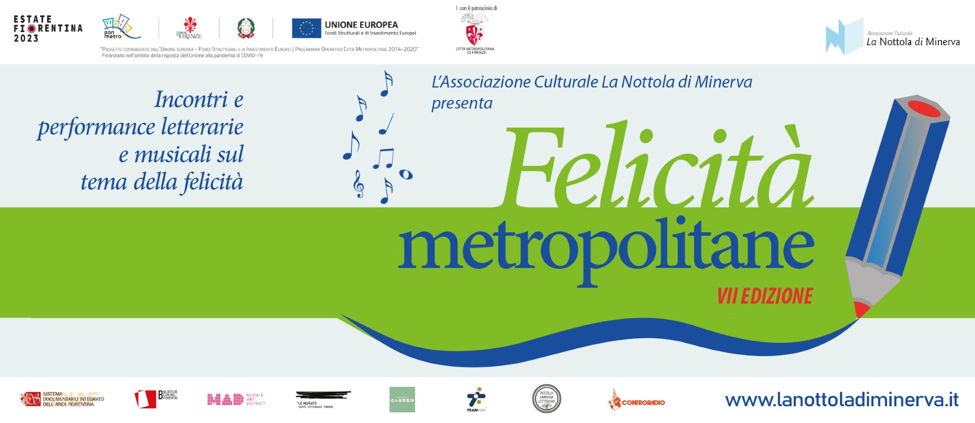 La rassegna Felicità Metropolitane è curata dall'Associazione culturale La Nottola di Minerva nell’ambito dell’Estate Fiorentina 2023 con il contributo del Comune di Firenze e il cofinanziamento dell'Uninio europea - fondi strutturali e di investimento europei - programma operativo città metropolitane 2014 - 2020 finanziato nell’ambito della risposta dell’Unione alla pandemia di COVID-19 – nonché con il patrocinio della Città Metropolitana e il contributo dello sponsor Tram di Firenze S.p.A.