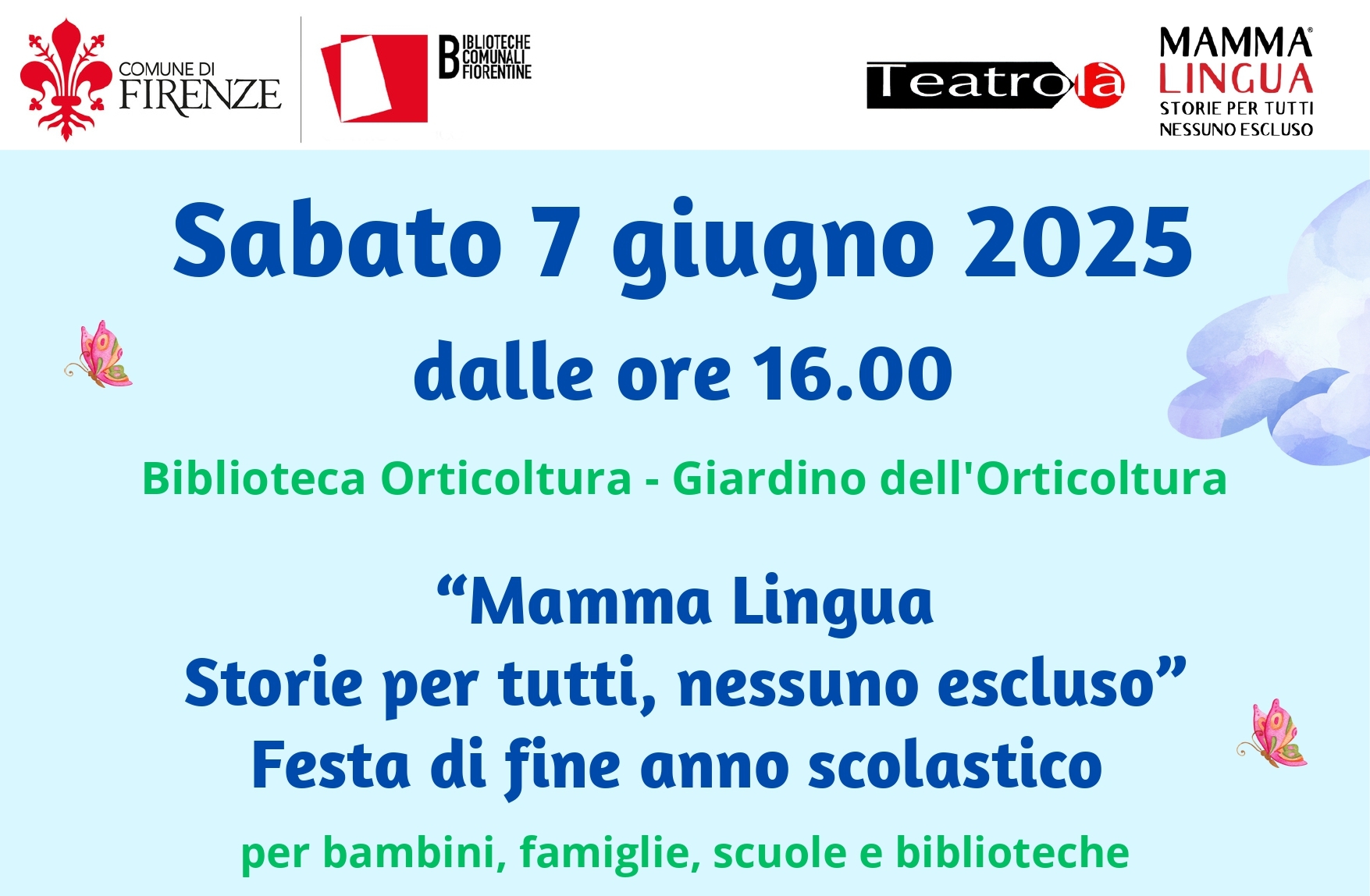 “Mamma Lingua Storie per tutti, nessuno escluso” festeggia la fine dell'anno scolastico sabato 7 giugno a partire nel Giardino dell'Orticoltura di fronte alla Biblioteca.