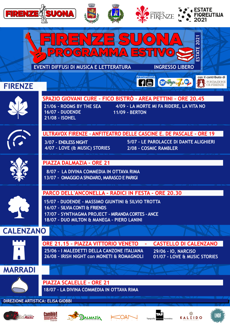 I luoghi del festival e le rassegne saranno: all' Area Pettini Burresi una rassegna dedicata ai semifinalisti e finalisti del Firenze Suona Music Contest c/o Spazio Giovani Cure – Fico Bistrò, all' Ultravox Firenze una rassegna di musica e letteratura al palco B, in collaborazione con Le Nozze Di Figaro presso l' Anfiteatro delle Cascine, in Piazza Dalmazia una mini-rassegna dedicata alla tradizione fiorentina e al Parco dell’Anconella c/o Anconella Garden il festival di musica non convenzionale RADICI IN FESTA , terza edizione in collaborazione con Radici Music e Cambiamusica !