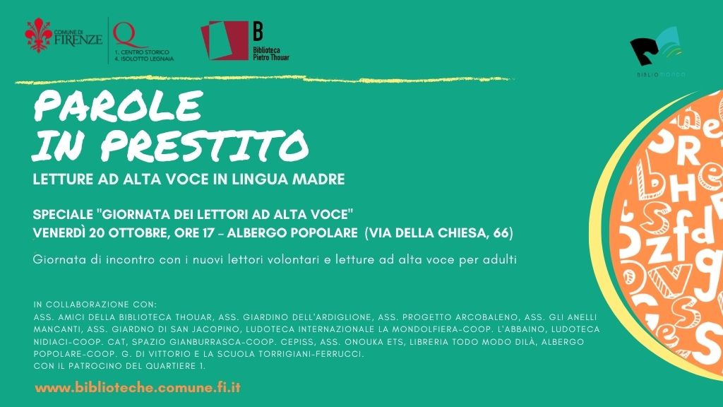 "Parole in prestito" è un progetto interculturale promosso dalla Biblioteca Pietro Thouar che ha come obiettivo la creazione di un gruppo di lettori volontari e la realizzazione di una rete nel quartiere che valorizzi il plurilinguismo e la lettura ad alta voce in lingua madre.