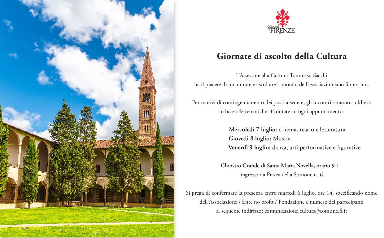 Si prega di confermare la presenza entro martedì 6 luglio ore 14, specificando nome dell’Associazione / Ente no profit / Fondazione e numero dei partecipanti al seguente indirizzo: comunicazione.cultura@comune.fi.it