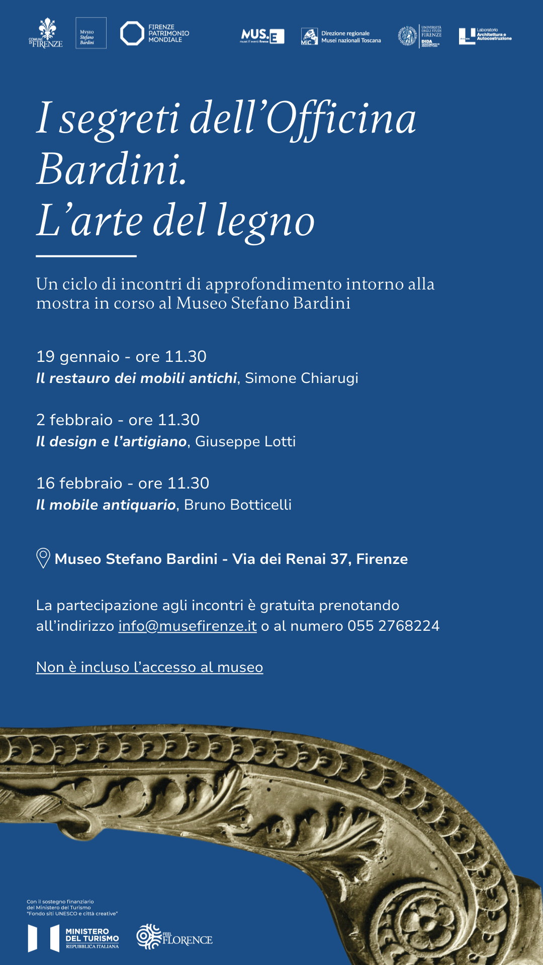 Questa serie di appuntamenti si inserisce nell’ambito della mostra "Officina Bardini: l’arte del legno" (fino al 24 febbraio), promossa dal Comune di Firenze - Musei Civici Fiorentini e Ufficio Firenze Patrimonio Mondiale con Fondazione MUS.E, Direzione regionale Musei nazionali Toscana del Ministero della Cultura – Museo e Galleria Mozzi Bardini con la collaborazione dell’Università degli Studi di Firenze.