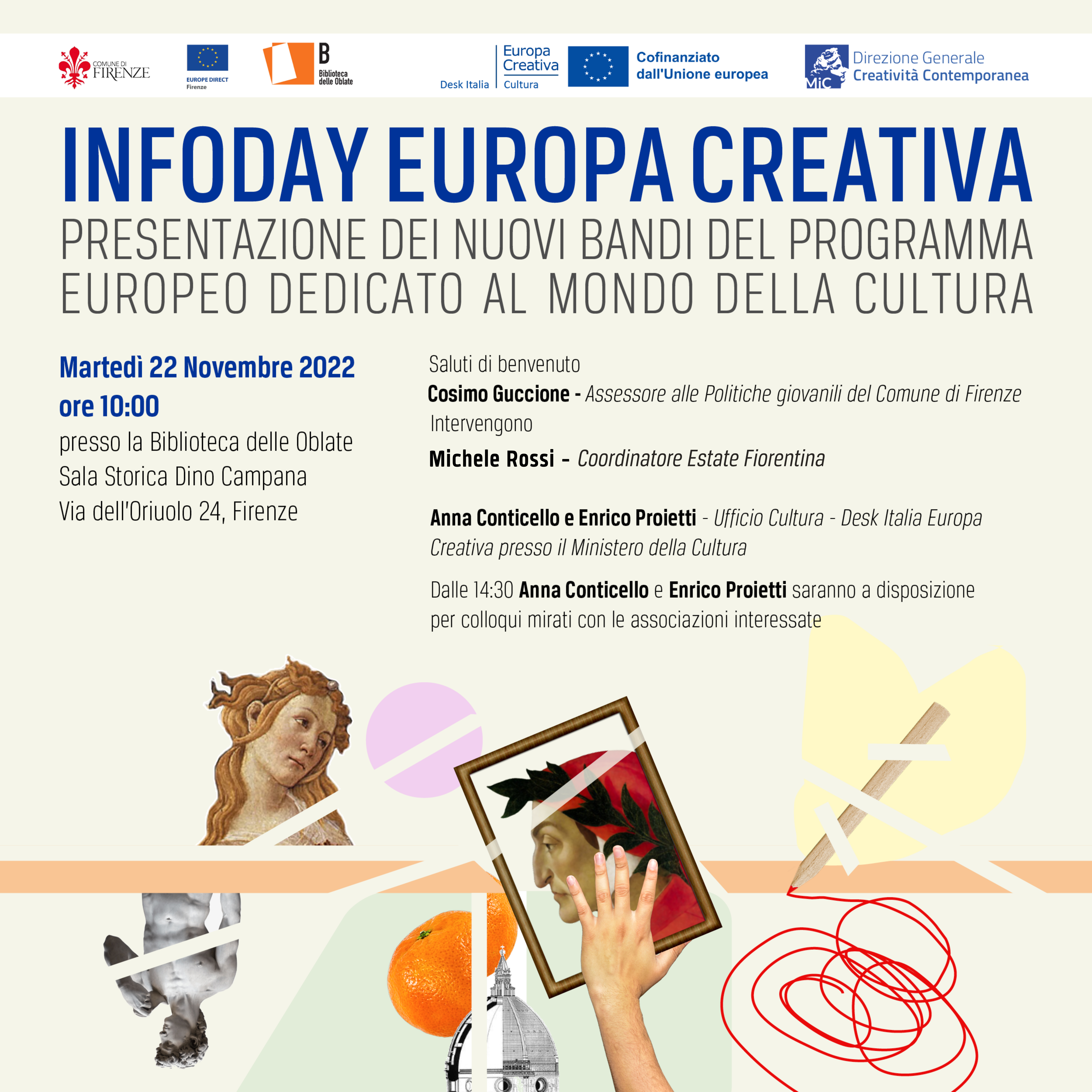 Martedì 22 novembre 2022 alle 10:00, presso la Sala storica Dino Campana della Biblioteca delle Oblate, ci sarà un incontro pubblico con Anna Conticello ed Enrico Proietti dell’Ufficio Cultura - Desk Italia del programma Europa Creativa del Ministero della Cultura.