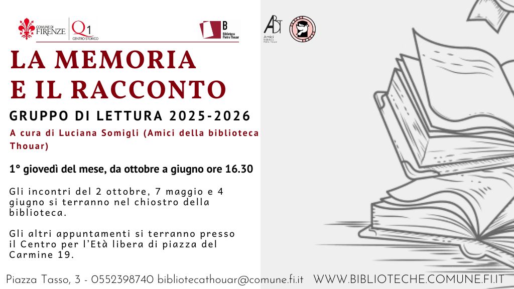 Il gruppo di lettura “La memoria e il racconto” rappresenta da anni una presenza viva e significativa nella programmazione culturale della Biblioteca Pietro Thouar di Firenze. Nato in collaborazione con l’associazione socio-culturale “Il Cortile”, ai tempi della storica sede in Piazza Santo Spirito, è diventato negli anni un appuntamento atteso da lettori affezionati e nuovi partecipanti.