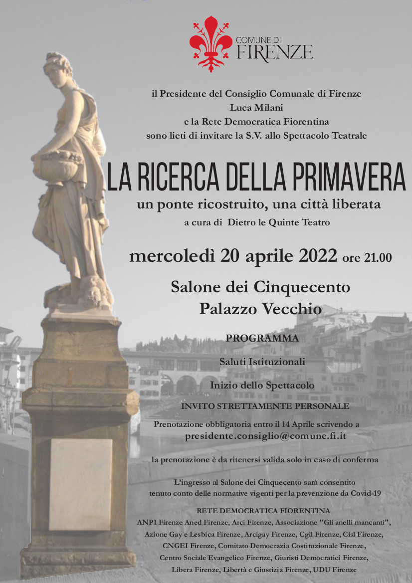 In occasione dell’anniversario della Festa della Liberazione il Consiglio comunale, unitamente alla Rete Democratica Fiorentina, promuove lo spettacolo teatrale “La ricerca della Primavera - Un ponte ricostruito, una città liberata” a cura di Dietro le Quinte Teatro, che verrà messo in scena mercoledì 20 aprile alle ore 21.00 nel Salone dei Cinquecento di Palazzo Vecchio.