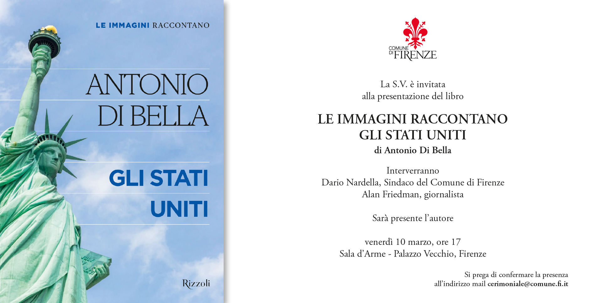 Il libro ‘Le immagini raccontano gli Stati Uniti’ del giornalista Antonio Di Bella, direttore per il genere Approfondimento della Rai e già direttore di Rai Tre e Rai News, sarà presentato venerdì 10 marzo alle 17 in Sala d’Arme a Palazzo Vecchio. Insieme all’autore saranno presenti il sindaco Dario Nardella e il giornalista Alan Friedman.