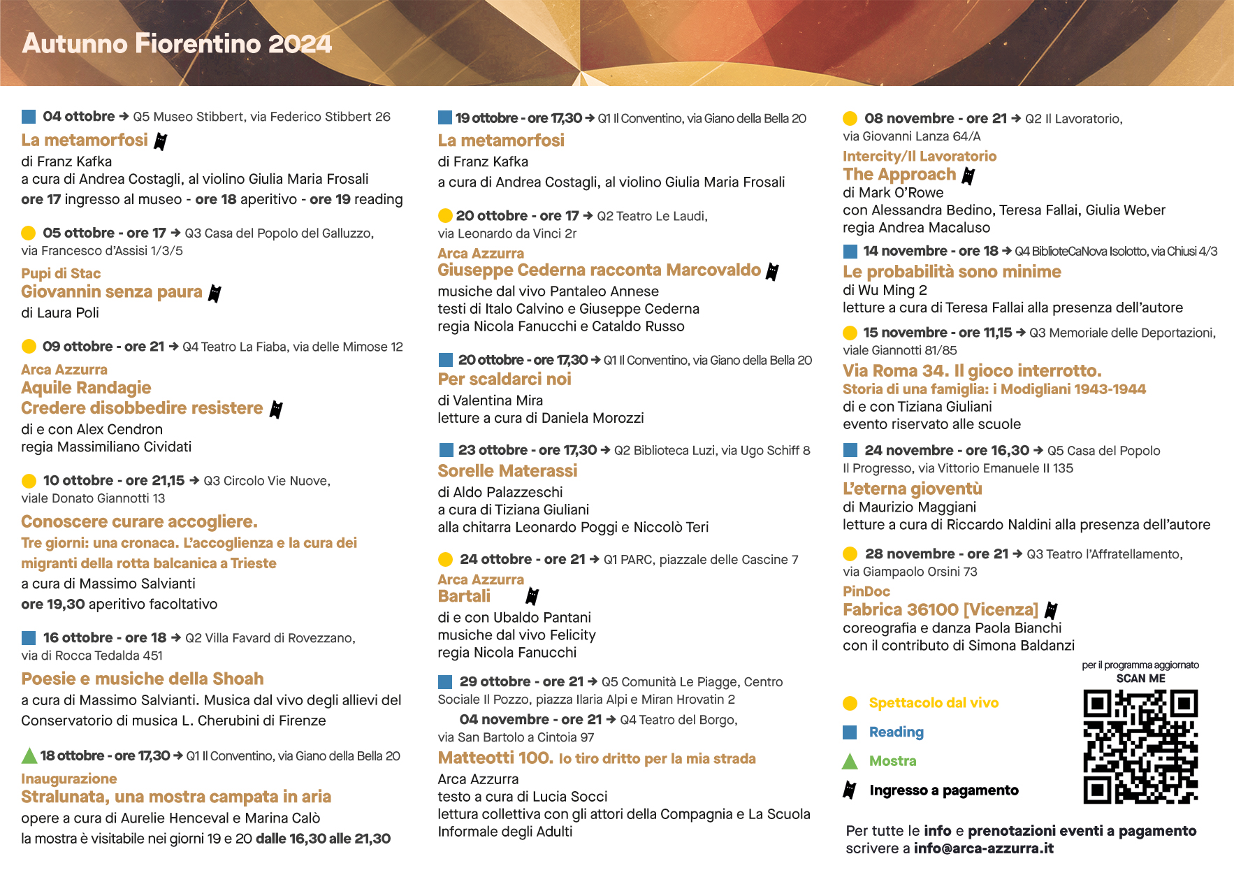 Autunno Fiorentino Rassegna con oltre 300 appuntamenti, tra spettacoli, concerti, performance, laboratori, workshop, corsi per bambini e adulti, dislocati nelle aree meno centrali della città. La rassegna è finanziata dal Fondo Nazionale per lo Spettacolo dal Vivo del Ministero della Cultura