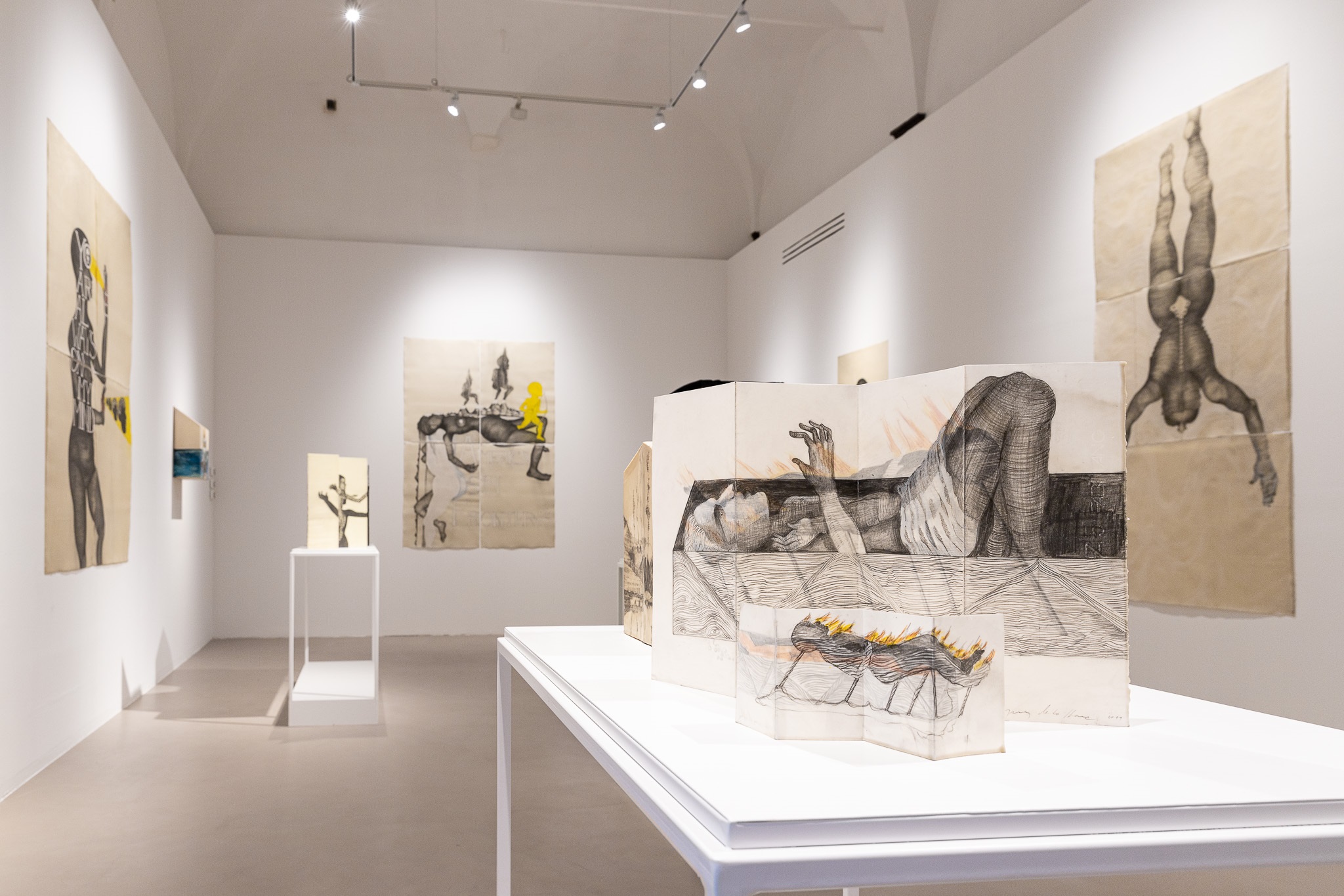 L’artista è cresciuta in una famiglia cattolica conservatrice durante la sanguinosa dittatura di Augusto Pinochet (1973- 1990). I suoi disegni hanno spesso come protagoniste delle donne o delle figure, che appaiono in un ambiente vuoto, senza sfondo, in posizioni o situazioni surreali o fantastiche, di rischio, talvolta erotiche. L’ampio vocabolario simbolico da cui attinge evoca anche la complessa storia latinoamericana, fatta spesso di scontri brutali e sottomissioni che drammaticamente perseverano tutt’oggi. I disegni, inchiodati direttamente alle pareti, nella loro nudità non lasciano scampo e si impongono allo spettatore spiazzandolo, imponendo un dialogo diretto e talvolta violento. Il suo stile e il suo vocabolario simbolico sono altamente riconoscibili. Mentre in passato ha lavorato su disegni di piccole dimensioni collocandoli sulle pareti in composizioni e giustapposizioni, nel lavoro più recente ha sviluppato grandi formati che vengono qui presentati insieme ai recenti sviluppi tridimensionali del suo lavoro: le “case” e i “leporelli”. Questi subiscono lo stesso trattamento dei disegni, vengono prima disegnati, poi immersi nella cera e hanno la caratteristica di unire due medium che raramente convivono: il disegno e la scultura. La prima casa è stata concepita partendo dalla memoria dell’abitazione modernista a Viña del Mar in cui l’artista abitò da bambina e che è ancora fonte di grande ispirazione. Al Museo Novecento viene presentato un ulteriore sviluppo del suo lavoro: la sua prima casa “aperta”, realizzata per questa mostra e nata ispirandosi a Mario Sironi di cui l’artista ha ammirato il lavoro durante il suo primo sopralluogo al Museo Novecento. Questa, diversamente dalle precedenti, è disegnata nel suo interno e simile ad un teatrino, con un uso cromatico decisamente più vario rispetto ai lavori del passato e ispirata, dice l’artista, anche dalla permanenza fiorentina e dai canoni prospettici rinascimentali. I leporelli, che consistono in fogli di carta piegati a fisarmonica, sono dei libri/sculture che verticalmente si annunciano al mondo. È presentata anche la piccola scultura “Yo soy Casa”, ultimissima produzione dell’artista e prima di una nuova serie mai esposta prima.