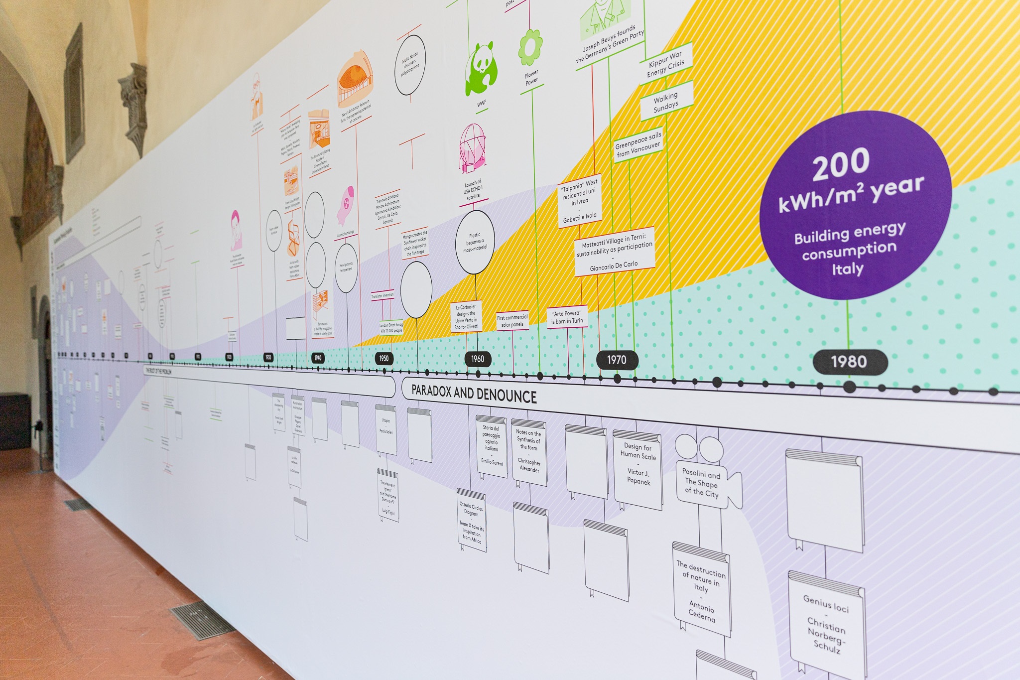 Cosa significa costruire in modo sostenibile? Questo tema, complesso e sfaccettato, è stato illustrato, sul “muro” al piano terra del Museo, attraverso il racconto del rapporto tra uomo e natura, della sua evoluzione nel corso della storia, che ha alimentato l’innovazione nel campo dell’architettura e dei materiali. Fin dal mito di Prometeo, l’uomo ha sempre tentato di oltrepassare una linea di demarcazione data dalle condizioni esterne, ma in presenza di un limite, in occasione di una crisi, è sempre stato in grado di produrre grandi innovazioni e trasformare una criticità in opportunità. La timeline di Sustainable Thinking Evolution “esplode” in uno spazio lungo dodici metri in cui vengono riportati le architetture, gli eventi e i fenomeni culturali che sono specchio di un agire sostenibile.