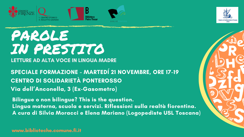 Primo incontro di formazione di "Parole in prestito", un progetto interculturale che ha come obiettivo la creazione di un gruppo di lettori volontari e la realizzazione di una rete nel quartiere che valorizzi il plurilinguismo e la lettura ad alta voce in lingua madre. La formazione si concentrerà sul rapporto tra bilinguismo e apprendimento dei bambini e delle bambine di lingua non italiana.