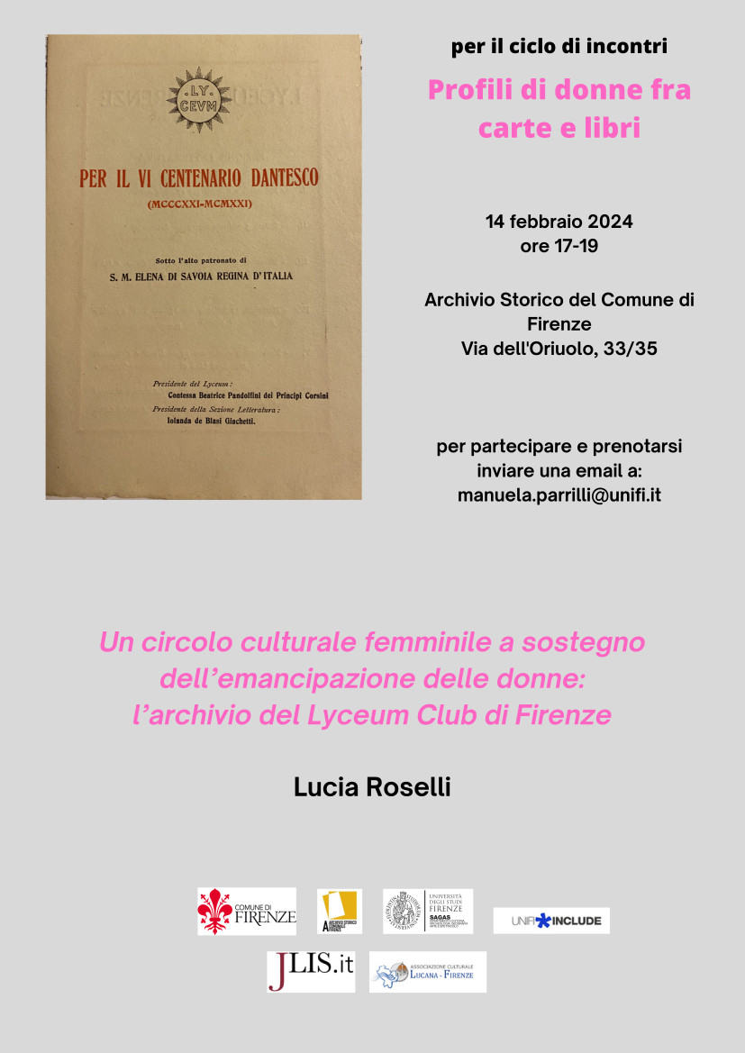 Mercoledì 14 febbraio interviene Lucia Roselli dell'Università di Pavia che illustrerà il ricco archivio della storica istituzione fondata nel 1908 come derivazione fiorentina dell'associazione nata a Londra solo quattro anni prima per iniziativa di Constance Smedley, il Lyceum Club Internazionale per artiste e scrittrici.