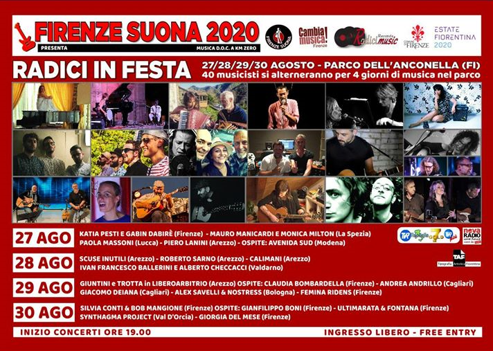 Festival Firenze Suona, Radici in Festa. Un evento unico e imperdibile, a ingresso libero, una maratona musicale in 4 serate che coinvolgerà quaranta artisti che si alterneranno sul palco ogni sera a partire dalle 19.00, incluso nel cartellone dell’Estate Fiorentina del Comune di Firenze. Più che un semplice concerto sarà una grandissima festa, l’incontro di musicisti che arriveranno da tante parti d’Italia e che sono tutti raggruppati sotto il marchio RadiciMusic Records.