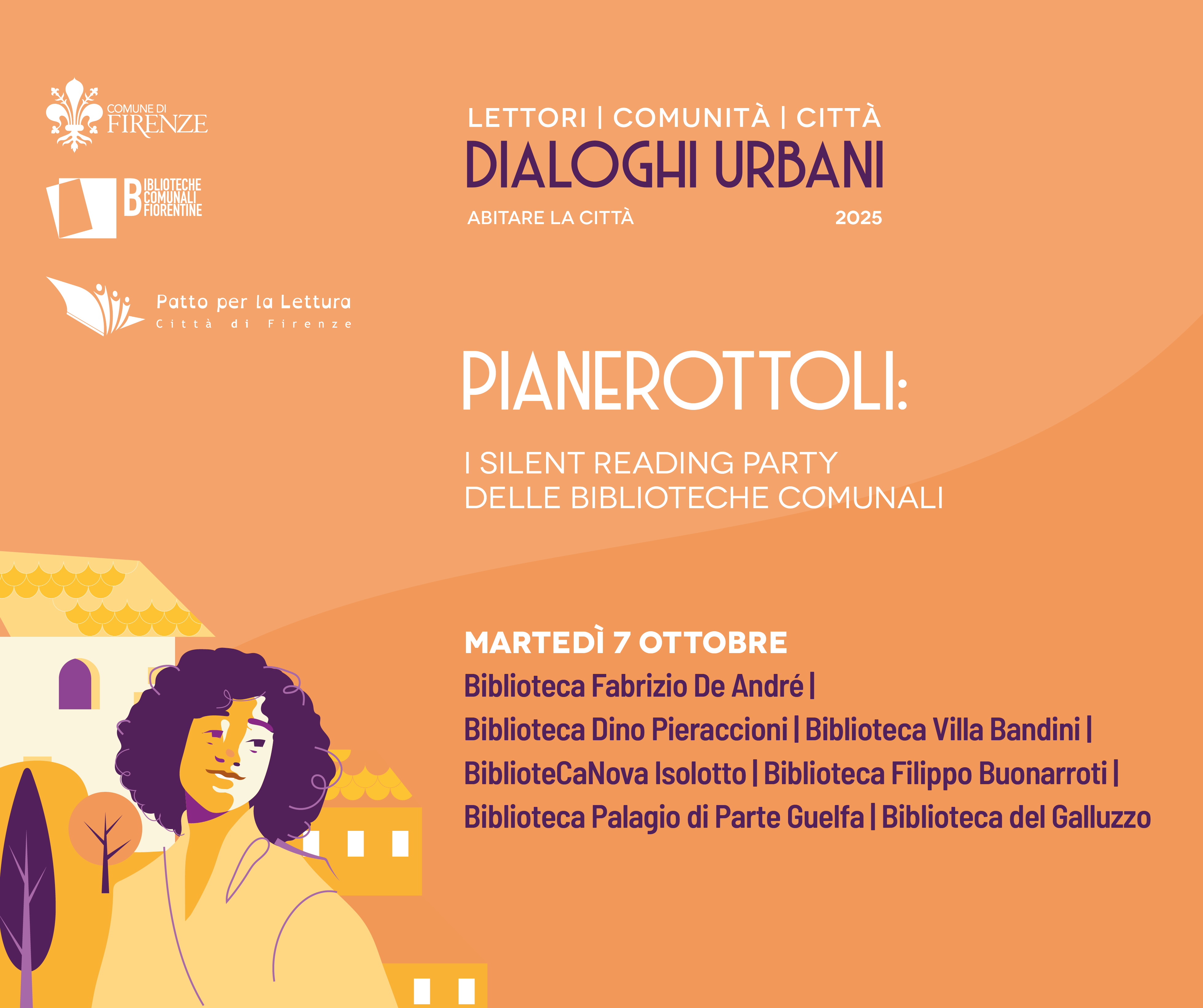 I silent reading book party "Pianerottoli" fanno parte della rassegna Dialoghi urbani curata dalle Biblioteche comunali fiorentine in collaborazione con la rete del Patto per la lettura, che unisce prospettive e voci diverse sul tema dello spazio urbano e della sua evoluzione.