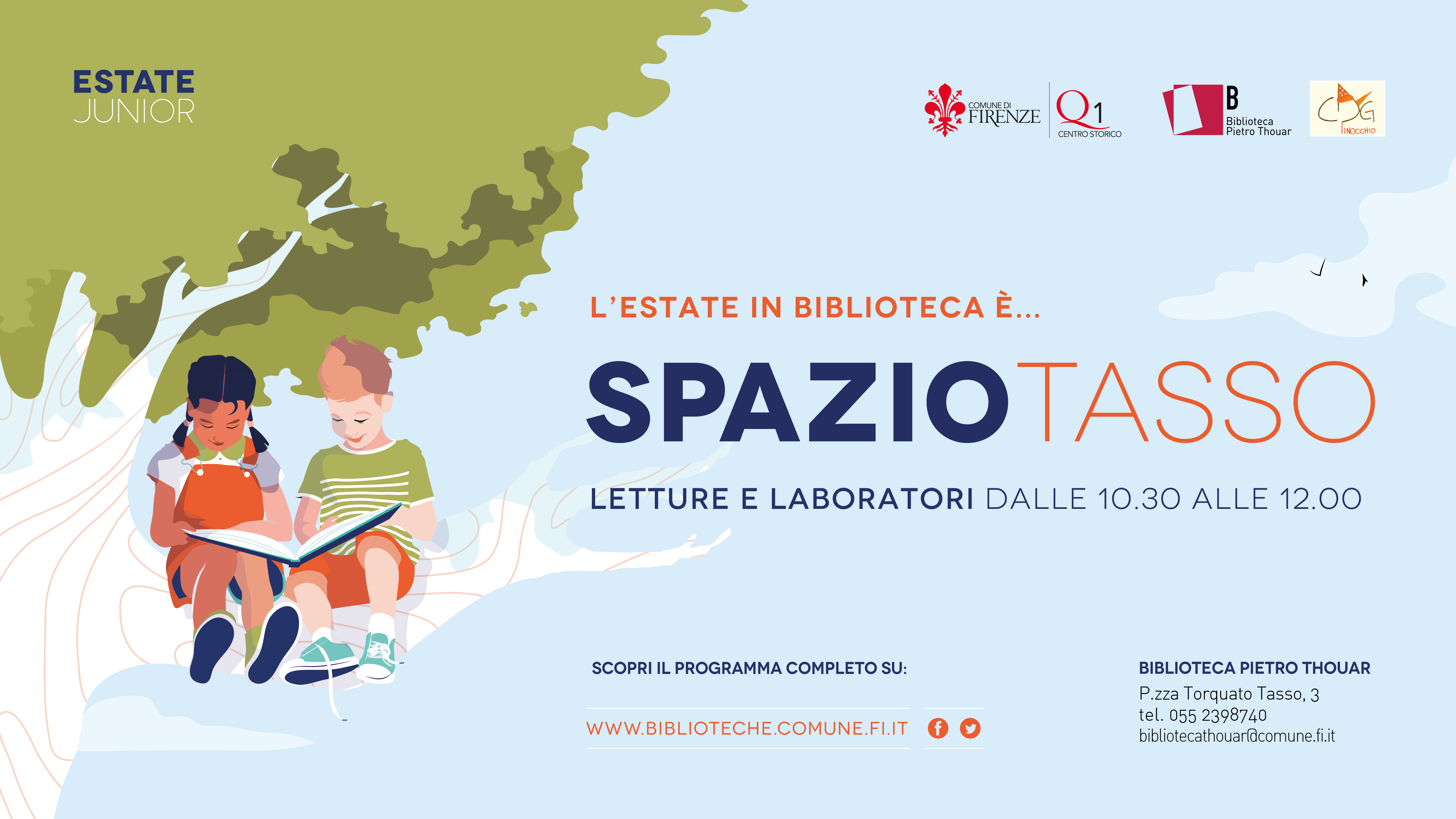 All’interno della biblioteca Thouar trovate un chiostro magico, uno spazio unico in tutto il quartiere d’Oltrarno: un luogo tranquillo e silenzioso dove si può studiare, leggere e lavorare. Il progetto Spazio Tasso nasce per promuovere i luoghi della biblioteca durante l’estate e offrire tempo di qualità a tutti. I ragazzi del CDG Pinocchio, supportati dai loro educatori e dalle bibliotecarie della sezione bambini, sceglieranno delle letture tematiche e a seguire dei laboratori calibrati a seconda dell’età dei partecipanti. I grandi potranno in tal modo dedicarsi allo studio, allo smart working o al semplice piacere di leggere un libro occupando una delle nostre postazioni interne o esterne provviste di wi-fi (presa di corrente da richiedere in fase di prenotazione).