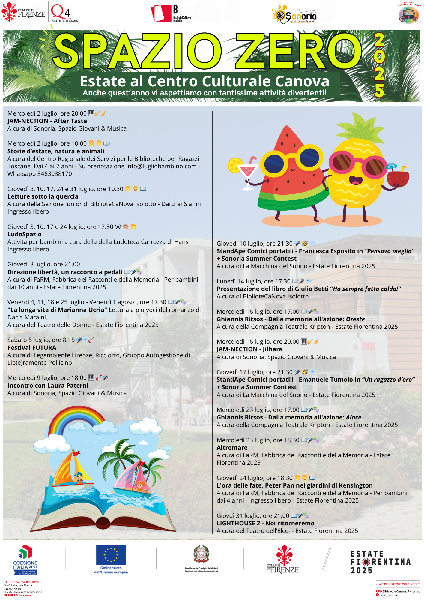 Da mercoledì 2 luglio sino a settembre torna Spazio Zero, la rassegna estiva del Centro Culturale Canova e della BiblioteCaNova Isolotto, che animerà il Quartiere 4 con un ricco calendario di appuntamenti gratuiti rivolti a tutte le età.