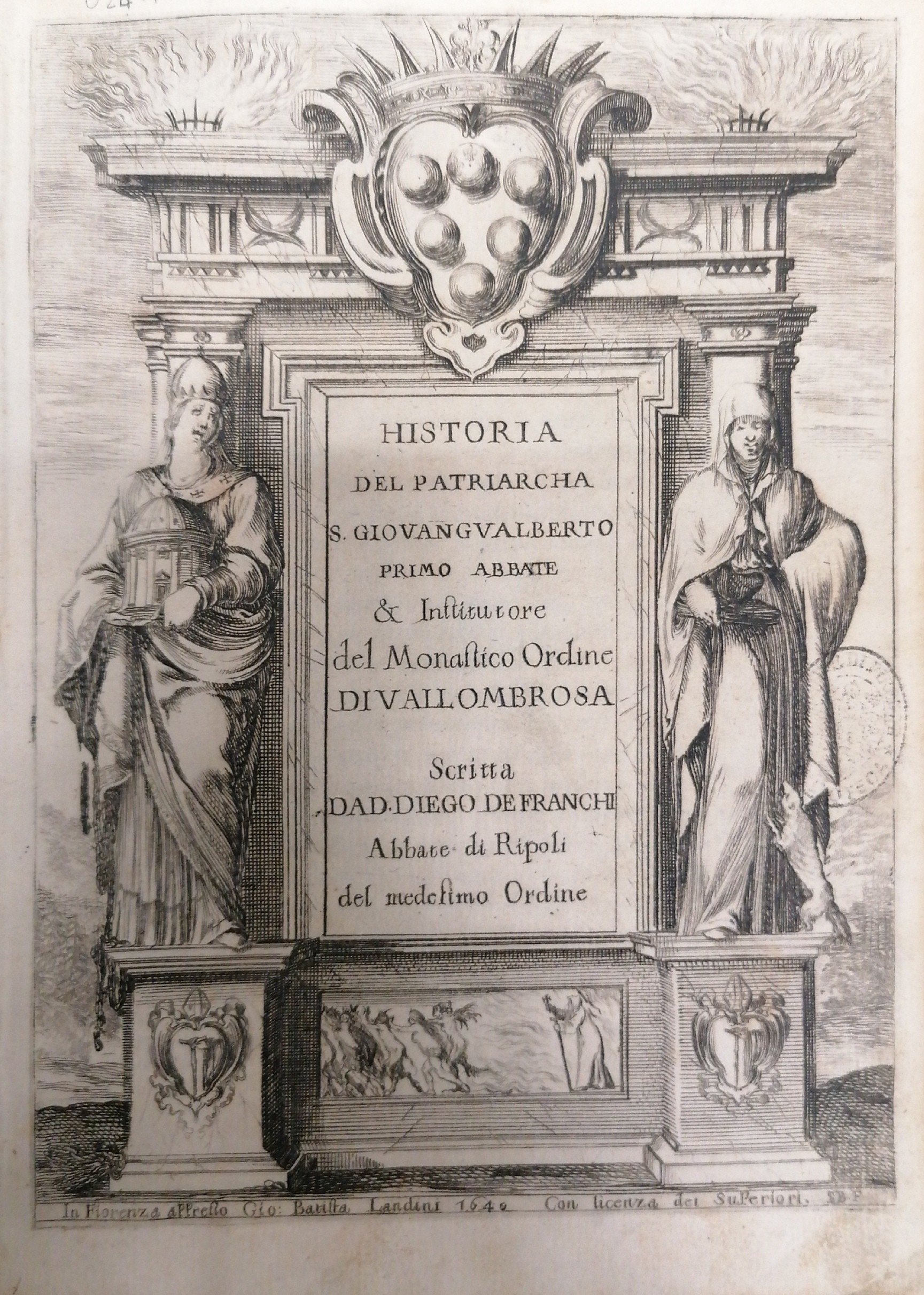 Frontespizio di uno dei libri esposti: Historia del patriarcha S. Giouangualberto primo abbate & institutore del monastico Ordine di Vallombrosa scritta da d. Diego de Franchi abbate di Ripoli del medesimo Ordine, del 1640.
