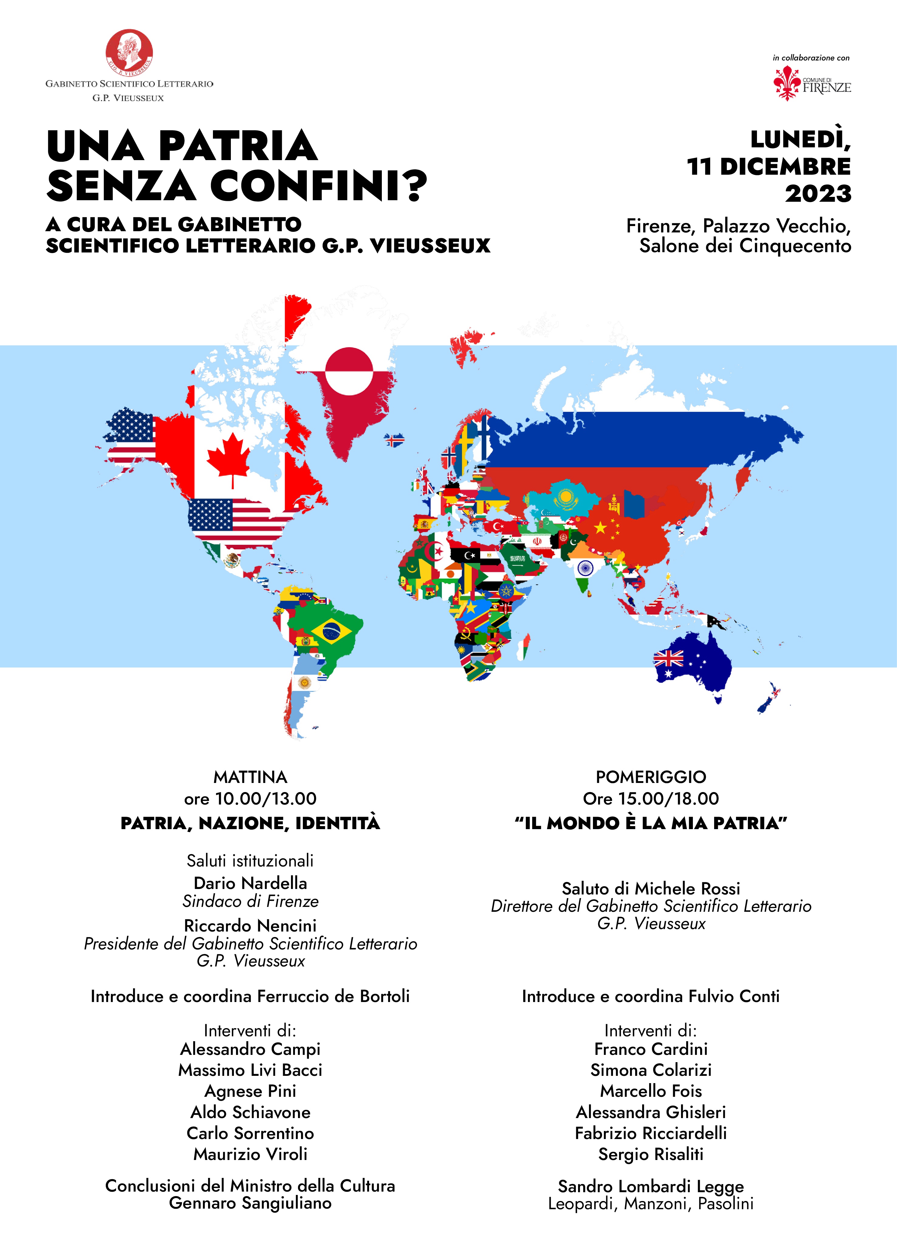 In Palazzo Vecchio si tornerà a parlare di patria l’11 dicembre al convegno "Una Patria senza confini?" a cura del Gabinetto scientifico letterario Vieusseux.