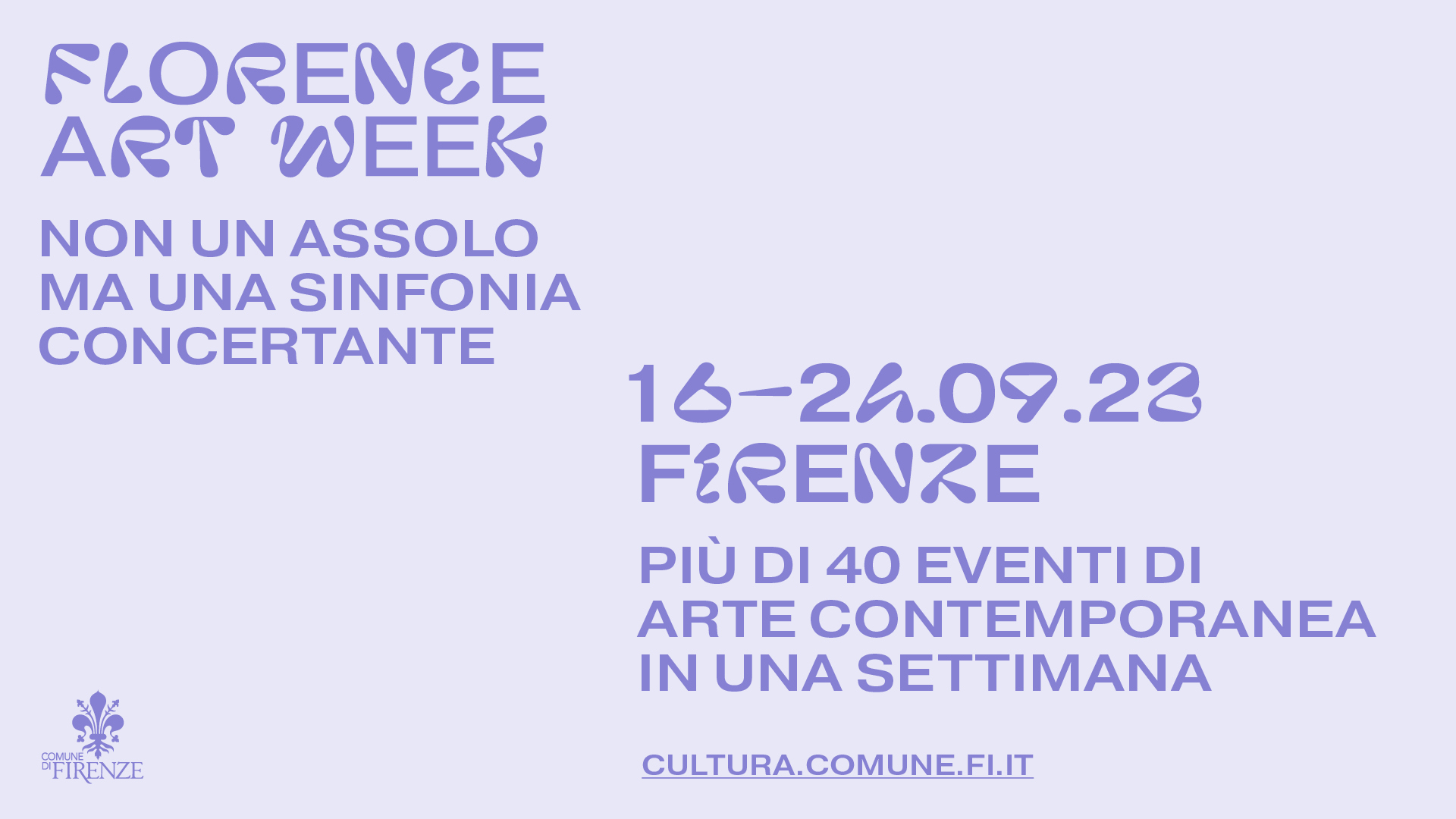 29 istituzioni culturali coinvolte, 43 eventi37 luoghi e 9 giorni di programmazione: Firenze diventa fucina e vetrina del meglio della produzione artistica contemporanea in occasione della prima edizione di Florence Art Week, palinsesto di appuntamenti risultato di un lavoro di squadra tra diverse e importanti realtà fiorentine fortemente voluto dal Comune di Firenze, in programma dal 16 e il 24 settembre 2022