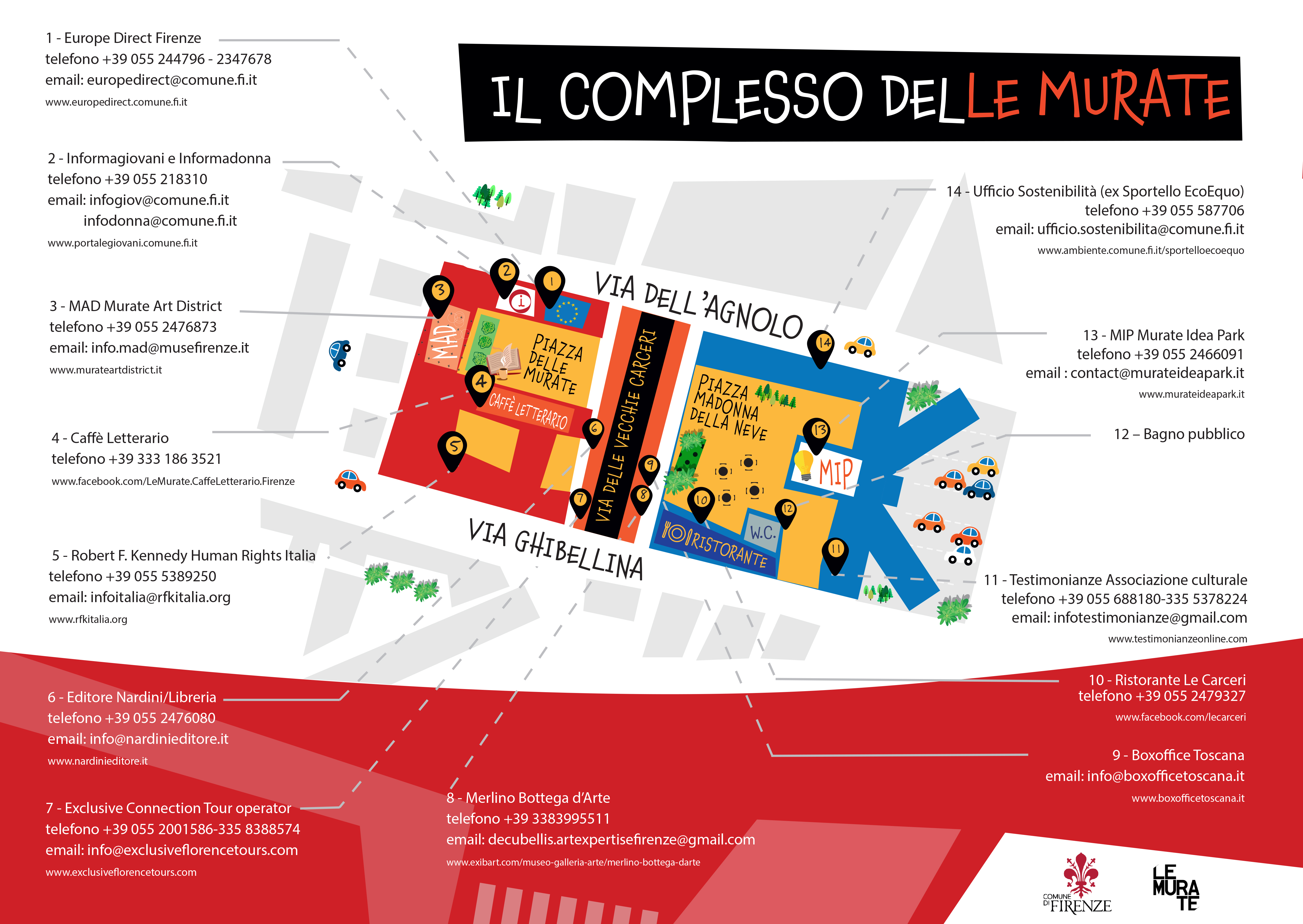 Il complesso delle Murate si trova nel cuore dello storico quartiere di S. Croce, è delimitato da via dell’Agnolo, via Ghibellina e viale Giovine Italia e si affaccia su piazza delle Carceri e piazza Madonna della Neve.