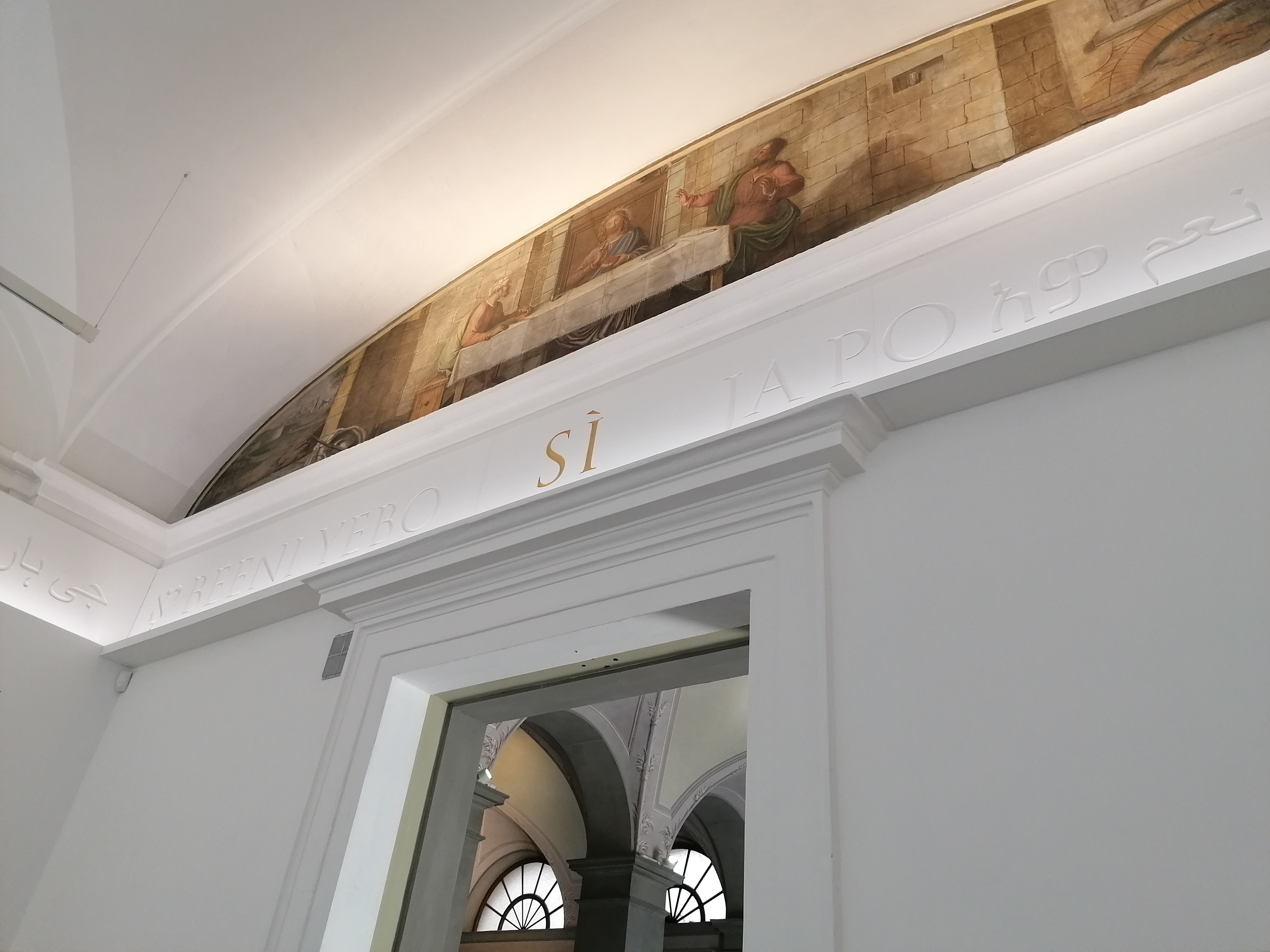 La prima sala è arricchita da un fregio che attorno al sì, nella cui sonorità già Dante sintetizzò espressivamente i caratteri della lingua italiana, allinea le differenti forme dell’affermazione in numerose lingue del mondo.