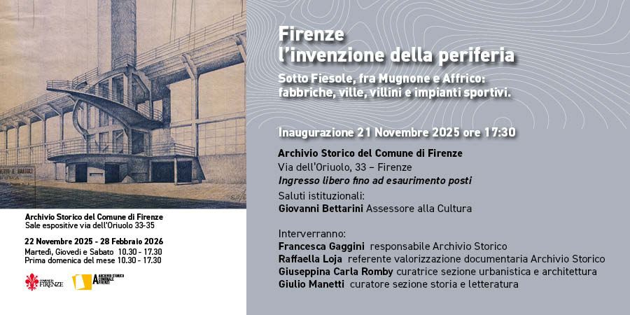 La mostra Firenze, l’invenzione della periferia - Sotto Fiesole fra Mugnone e Affrico: fabbriche, ville, villini e impianti sportivi verrà inaugurata VENERDI 21 NOVEMBRE alle ore 17:30 e resterà aperta fino al 28 FEBBRAIO 2026 (vedasi brochure in allegato).