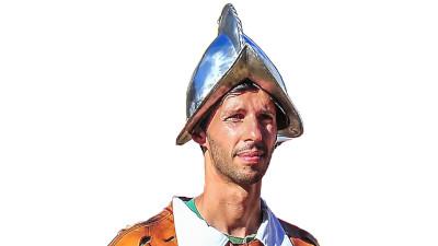 Morione a barca: tipico elmo di metallo a coppo alto e schiacciato terminate a cresta, con tesa a punte rialzate per lasciare libera la vista al tiro.