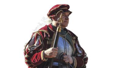 Indossa costume di velluto grigio con maniche soppannate di raso avorio e mantello di panno rosso con bordatura di velluto grigio; porta berretta di panno rosso piumata di bianco, calza stivali scamosciati con speroni ed ha armatura composta da collarina e corazza: è armato di spada.