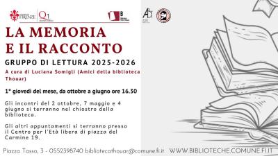 Alla Biblioteca Thouar riprende il 2 ottobre il gruppo di lettura. Incontri condivisi, aperti a tutti, per scoprire il piacere della letteratura e della memoria
