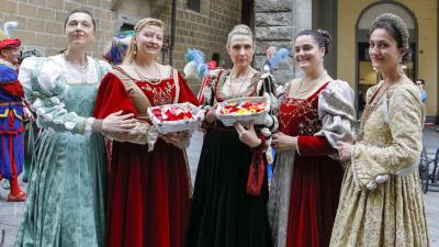 La cerimonia, preceduta dalla messa nella Cappella dei Priori di Palazzo Vecchio, si svolge in Piazza della Signoria, con il Corteo Storico della Repubblica Fiorentina che raggiunge il Ponte Vecchio da dove vengono lanciati dei fiori in Arno.