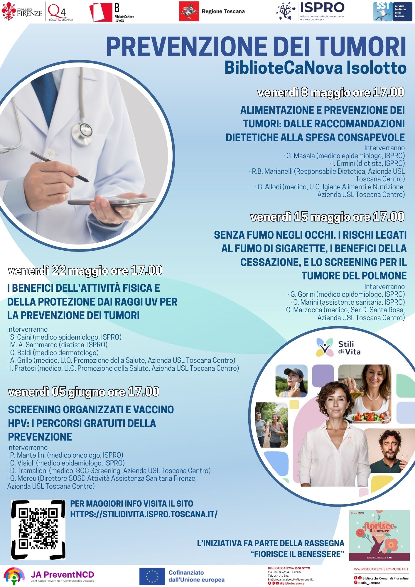 L’iniziativa, a ingresso libero, è realizzata con la collaborazione della Regione Toscana, del Sistema Sanitario della Toscana e del progetto JA PreventNCD, cofinanziato dall’Unione Europea. Gli incontri sono curati dall’Istituto per lo studio, la prevenzione e la rete oncologica (ISPRO) e dalla Società della Salute.