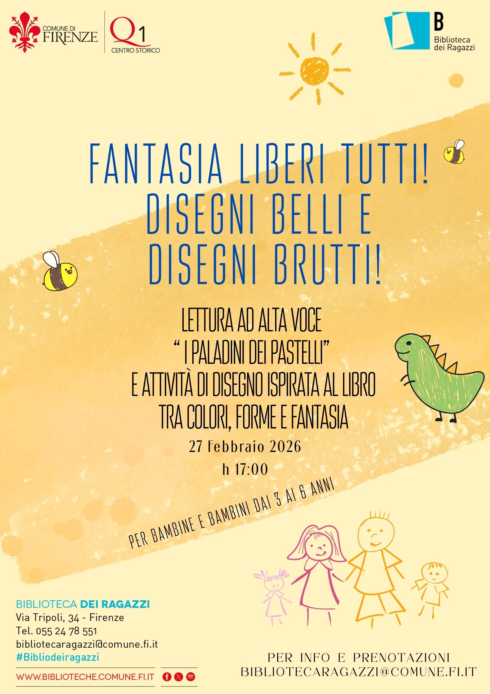 La partecipazione all’attività è gratuita previa prenotazione contattando la Biblioteca al numero 055 247 8551 o all'indirizzo bibliotecaragazzi@comune.fi.it