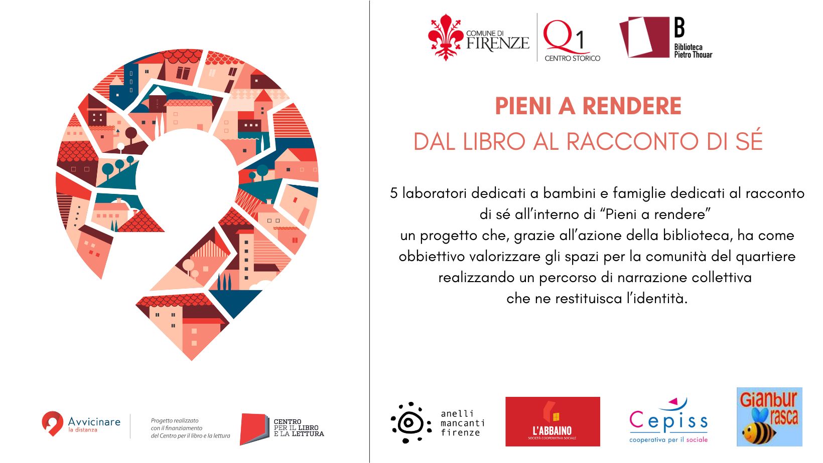 5 laboratori, che si svolgono presso lo Spazio Gianburrasca (via Palazzuolo 35), dedicati a bambini e famiglie dedicati al racconto di sé all’interno di “Pieni a rendere” un progetto che, grazie all’azione della biblioteca, ha come obbiettivo valorizzare gli spazi per la comunità del quartiere realizzando un percorso di narrazione collettiva che ne restituisca l’identità.