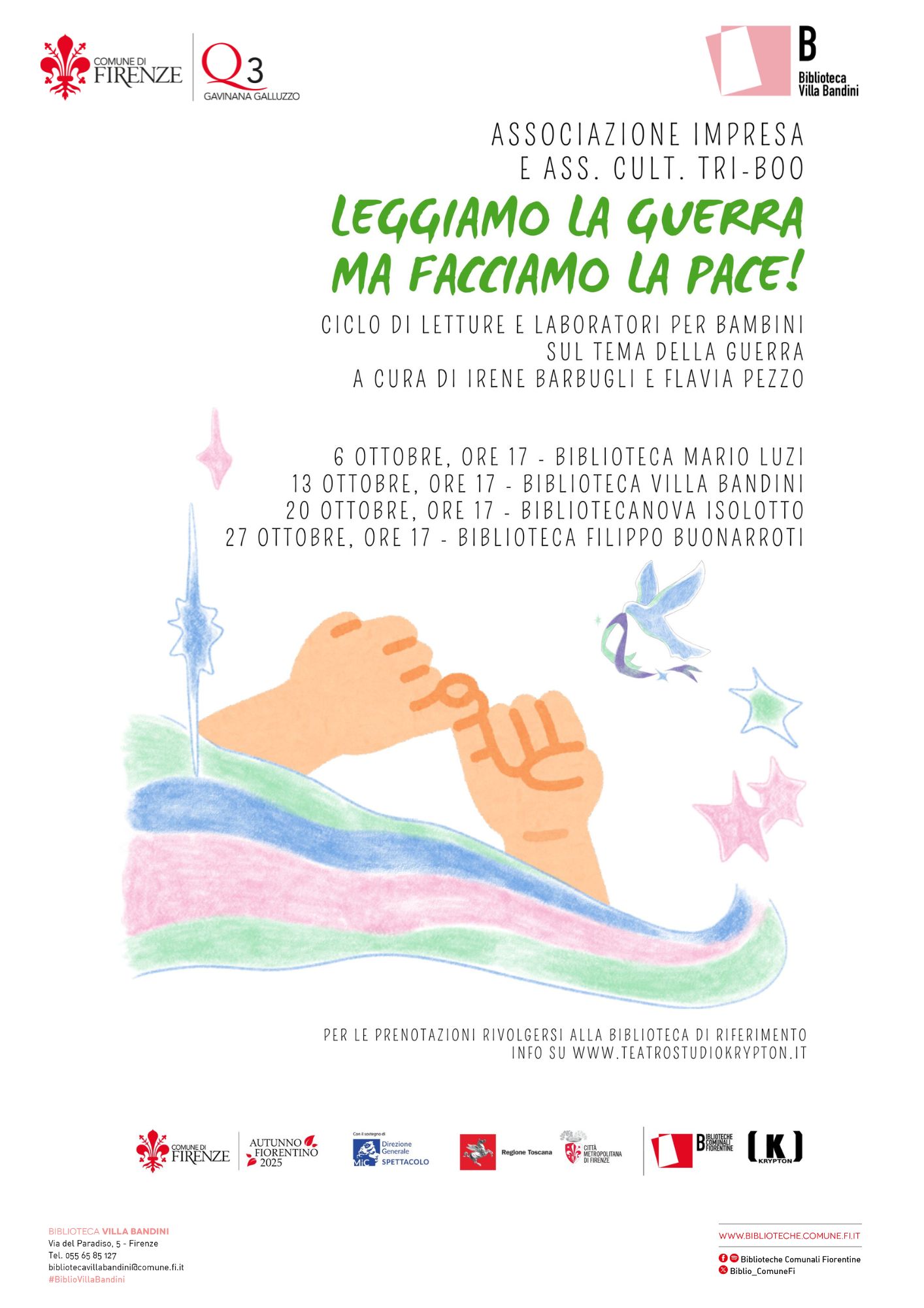 Ciclo di letture e laboratori nelle biblioteche comunali fiorentine sul tema della guerra, per bambine e bambini dai 5 anni. A cura di Irene Barbugli e Flavia Pezzo, Associazione Impresa e Associazione Tri-Boo, in collaborazione con la Compagnia Teatrale Krypton.