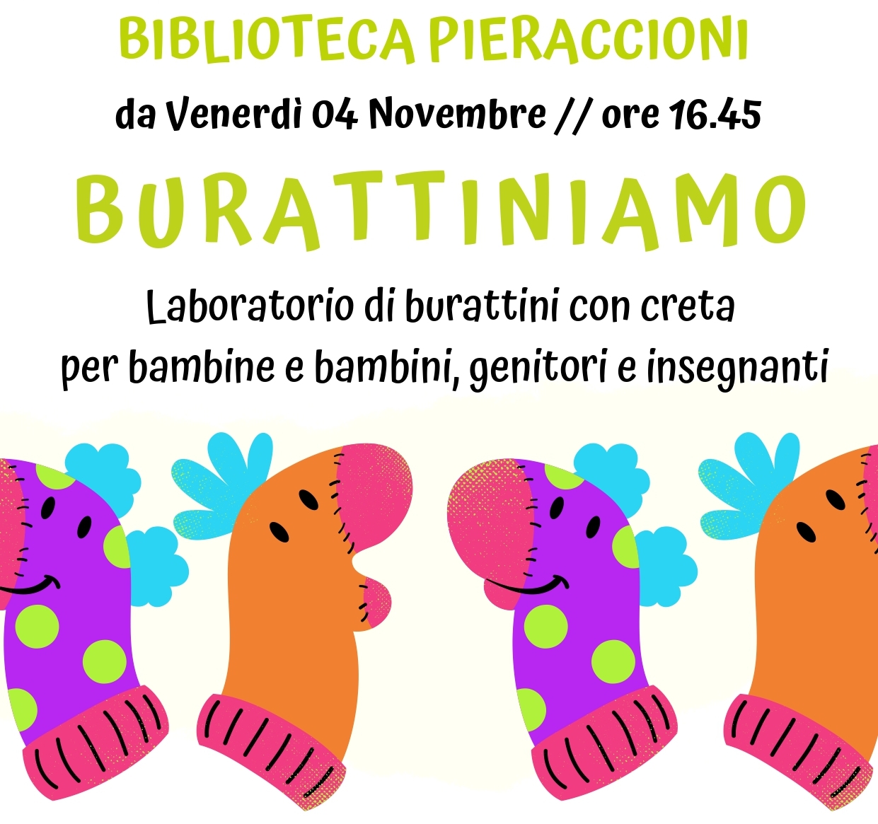 A partire da venerdì 4 novembre la Biblioteca Dino Pieraccioni organizza un ciclo di laboratori che vuole favorire la fantasia e la creatività dei singoli partecipanti, utilizzando le regole elementari del teatro dei burattini.