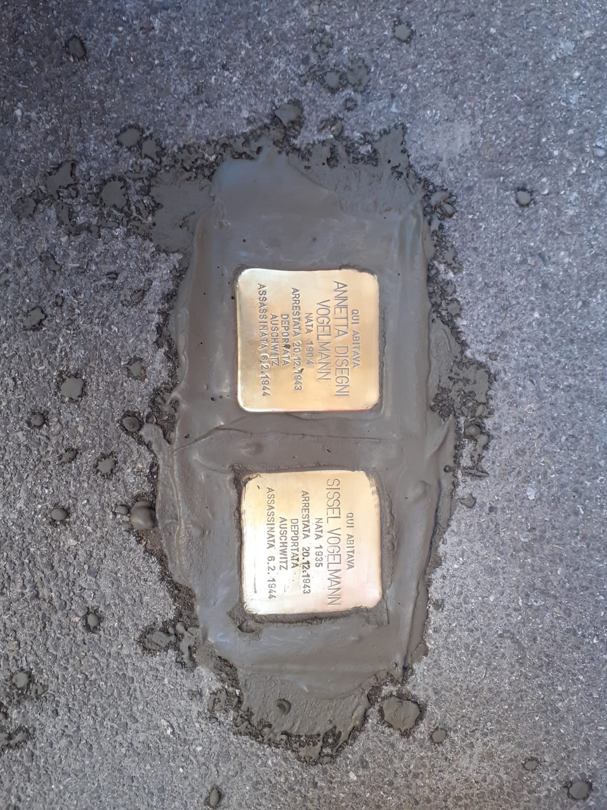 Qui abitava una famiglia felice: mio padre Schulim Vogelmann, sua moglie Annetta Disegni e la loro piccola Sissel. Nel 1938, a causa delle leggi razziali, Annetta fu espulsa dalla scuola dove insegnava e Sissel dall’asilo comunale. Ma, bene o male, la vita continuava. Poi, dopo l’8 settembre 1943, iniziò la caccia all’ebreo. Nel dicembre dello stesso anno tentarono di fuggire in Svizzera, ma a Sondrio furono scoperti e internati a Villa La Selva nei pressi di Firenze. Dopo una breve permanenza nel carcere di San Vittore a Milano, il 30 gennaio 1944 furono caricati al binario 21 su un vagone bestiame e spediti ad Auschwitz. Dopo sei giorni di un terribile viaggio arrivarono a destinazione, dove Annetta e Sissel vennero subito selezionate per la camera a gas, mentre mio padre riuscì poi a salvarsi.