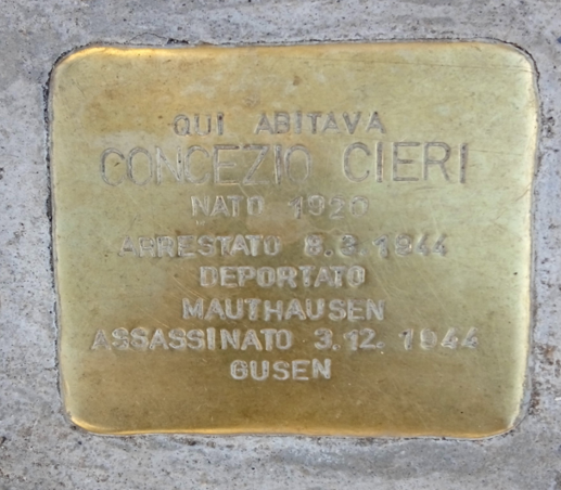Cieri Concezio era nato a Bari il 05 ottobre 1920, si era trasferito con la famiglia a Firenze all’età di 4 anni per seguire il padre che era impiegato al Genio Civile abitava in via del Romito 46 dove si trovava la vecchia casa di famiglia che, purtroppo è stata demolita per fare spazio ad un nuovo palazzo. Non l’abbiamo conosciuto, ma con le foto ed i racconti familiari lo abbiamo sempre avuto vicino. Nostro zio Concezio (Ezio per la famiglia), dal nome del nonno paterno, è stato il primo figlio maschio dopo 5 graditissime figlie. Aveva già svolto gli obblighi civili e militari, nel dicembre 1940 era militare ad Alessandria e poi era stato mandato al fronte in Francia da dove era tornato dopo l’armistizio dell’8 settembre del 1943. Non aveva ancora 24 anni quando nella mattina dell’8 marzo del 1944 (io Donatella, sua nipote, nascevo l’11), è stato portato via dai repubblichini in una retata in seguito agli scioperi del 4 marzo, mentre aspettava il tram vicino a casa che lo portava in Borgo San Frediano a dare una mano nel negozio di scarpe dei Mazzanti, amici di famiglia. Pare che fosse molto elegante, nonostante indossasse un bel cappotto “rigirato” come si usava fare allora. Dai racconti conosciamo l’angoscia della famiglia nel cercarlo, nessuno riusciva a darsi pace, sappiamo che fu deportato il pomeriggio stesso della cattura, con un treno carico di deportati diretto al campo di sterminio di Mauthausen, e che morì nel sottocampo di Gusen a 24 anni appena compiuti il 03 dicembre 1944 dopo quasi 9 mesi di Lager. La famiglia fu avvertita a seguito di una lettera della Croce Rossa Italiana.